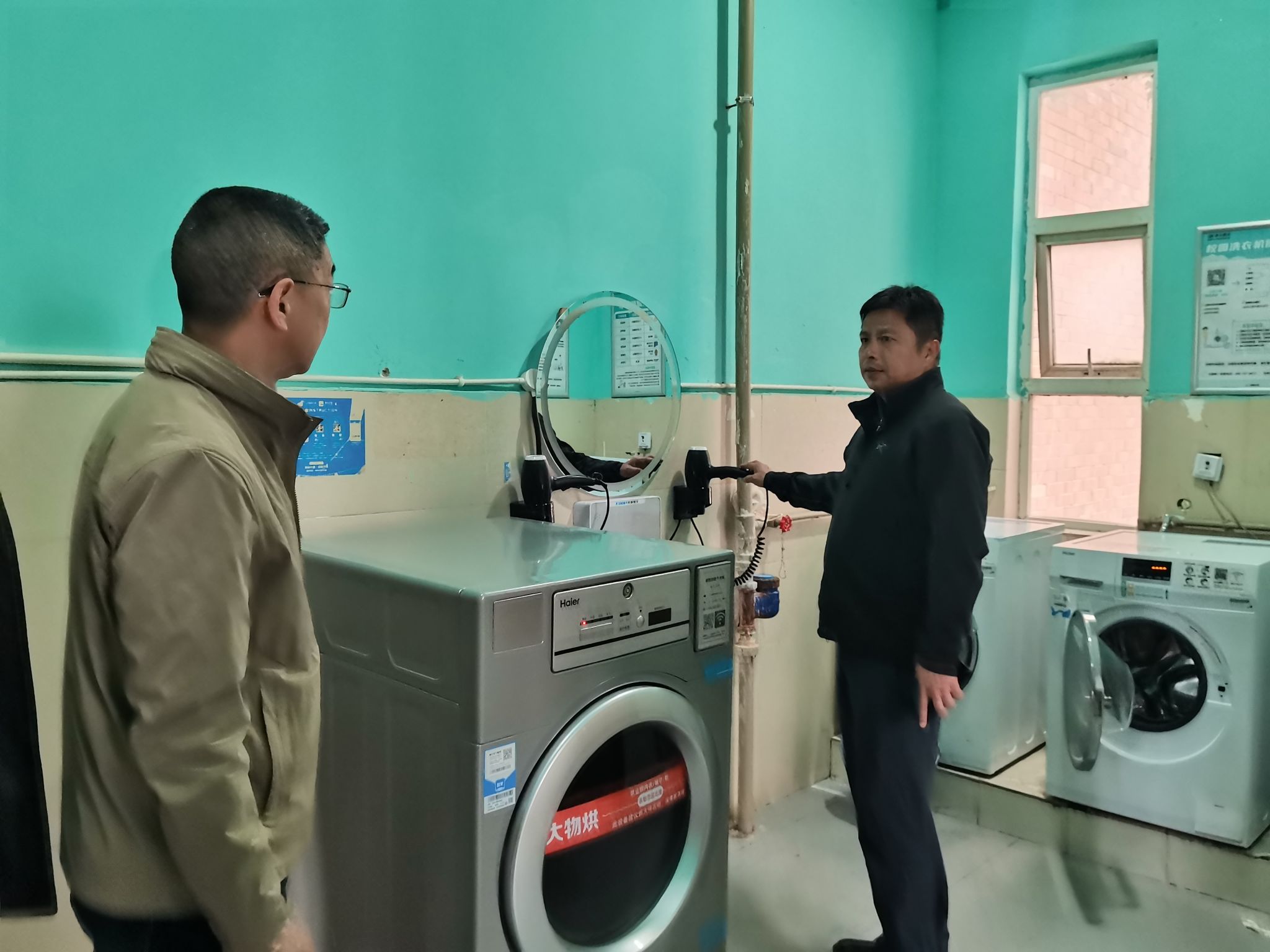 调研期间,集团领导重点检查了洗衣房、洗浴间、自助吹风机、直饮水等设施的运行状态与使用便利性。罗洪刚现场扫码核查设备信息及价格,详细询问设施配置标准与日常运维细节,全面掌握设施运行实际情况,对各项服务工作给予肯定。