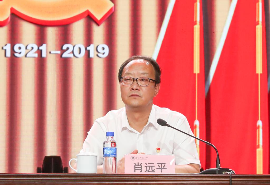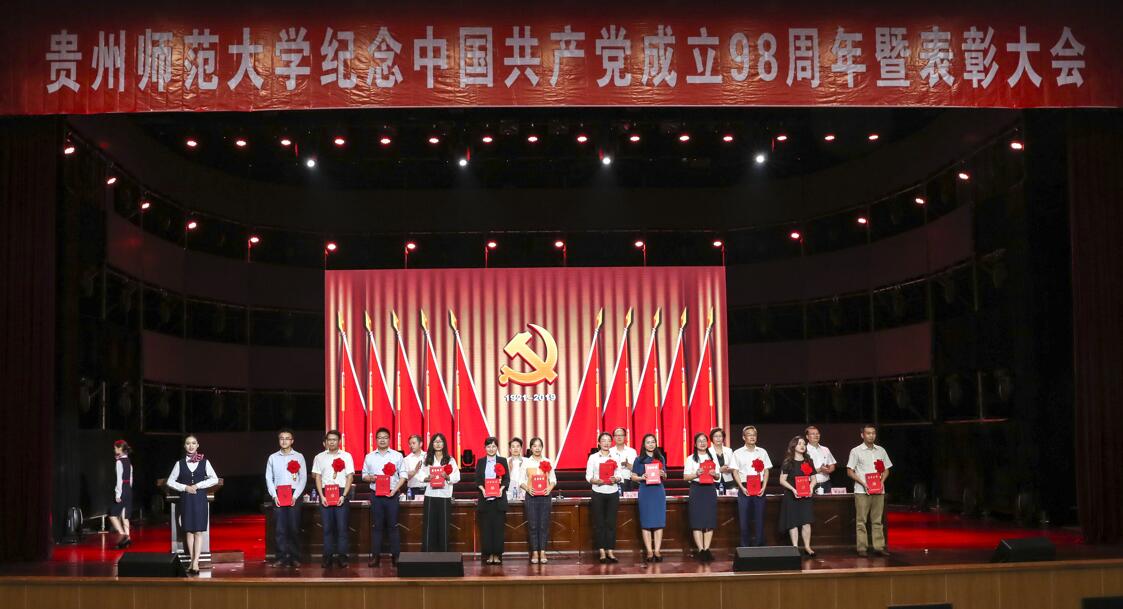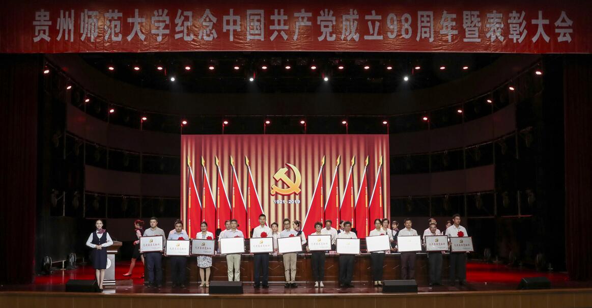 为纪念中国共产党成立98周年,回顾党的光辉历程,讴歌党的丰功伟绩,表彰近年来在学校改革发展事业中涌现出来的优秀共产党员、优秀党务工作者和先进基层党组织,6月26日下午,学校在花溪校区礼堂隆重举行纪念中国共产党成立98周年暨表彰大会。校领导韩卉、肖远平、乙引、银熙惠、陈云坤、罗永祥出席。全校中层党员干部,受表彰的优秀个人和先进集体,各基层党委(党总支)委员、党支部书记代表,师生党员代表,离退休老党员代表和宣誓的新党员代表,共1000余人参加。校党委副书记、校长肖远平主持会议。