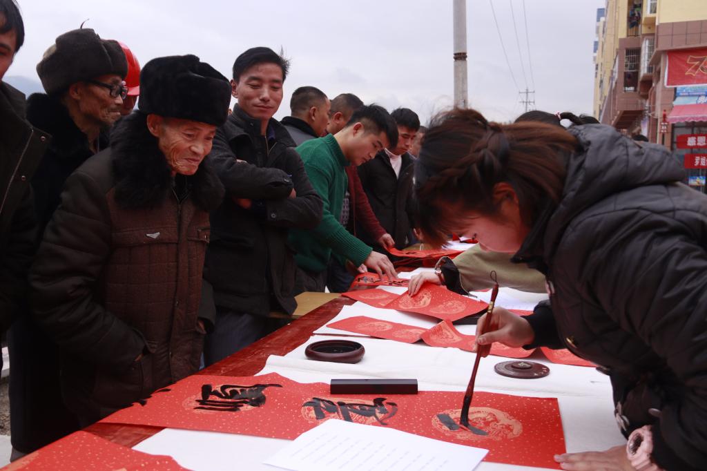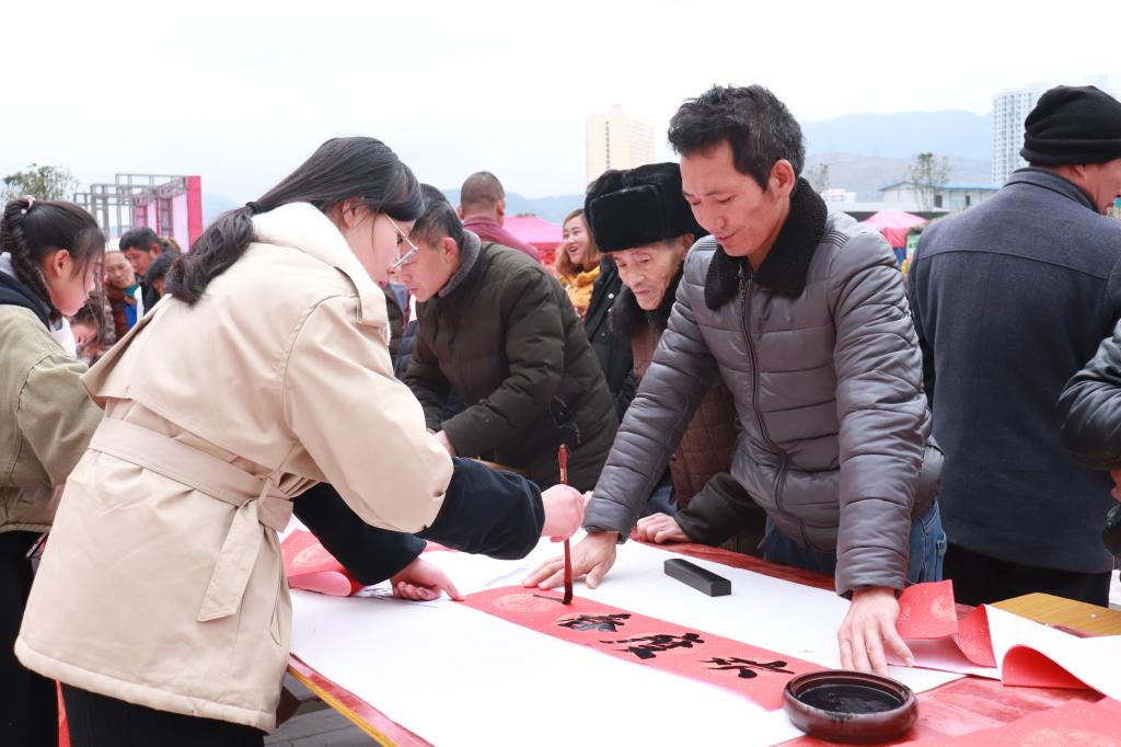 美术学院带来的“迎春接福写春联 挥毫泼墨贺新年”主题活动异常火爆,等候领取春联的群众将自己心仪的“书法家”围得水泄不通。正在读初二的余小雨和爷爷一道,等了一个多小时,才好不容易“争到”一幅墨迹未干的春联。“这可是大学书法家们写的春联呢!“余小雨的脸上漾起了幸福的笑脸。“我想好好读书,考上大学,学到本领,回来建设我们美丽的家乡。”余小雨说。