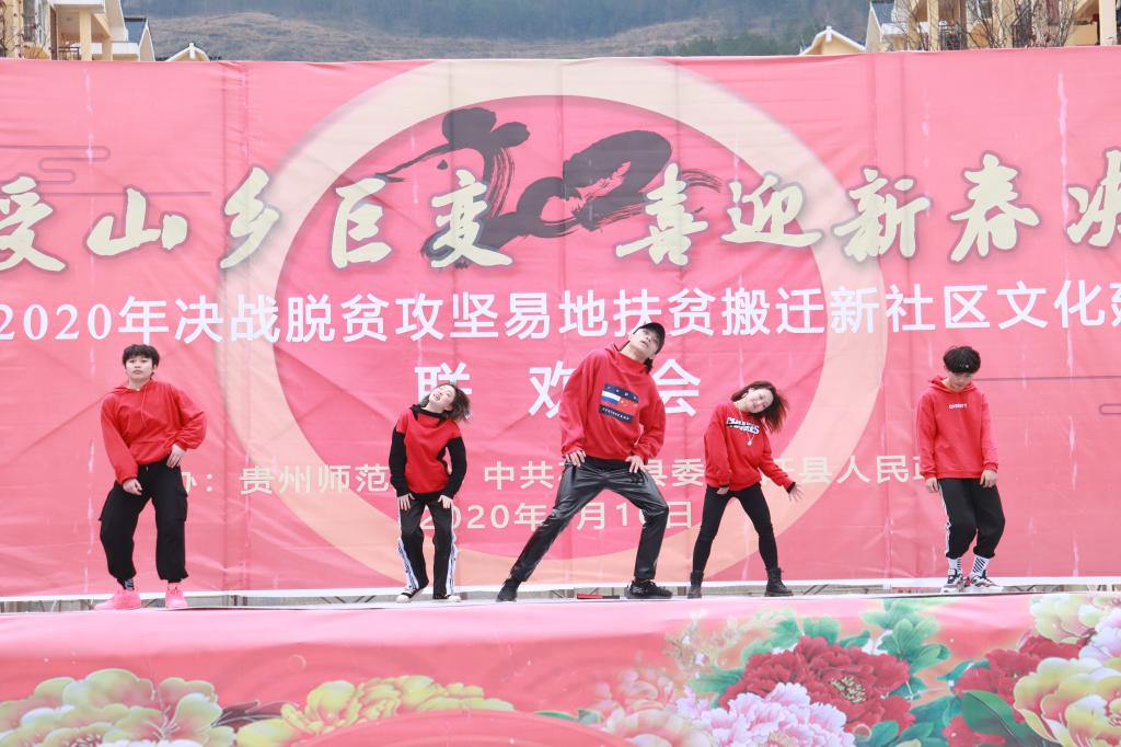 “听说还有舞狮表演呢。”“快点儿,去晚了就抢不到好位置了。”尽管室外气温接近冰点,罗家寨安置点的搬迁居民非但没窝在家里守着火炉,反而循着音乐声,向露天广场聚拢,参加贵师范大学师生带来的联欢会盛宴。舞狮表演、快闪表演《我和我的祖国》、互动活动、新年祝福歌……舞台前,座无虚席。在轻松愉悦的氛围下,志愿者们用专业的表演,用艺术的感染力,让搬迁群众感受到更多的新家温暖,让搬迁群众进一步坚定脱贫致富的信心与决心。