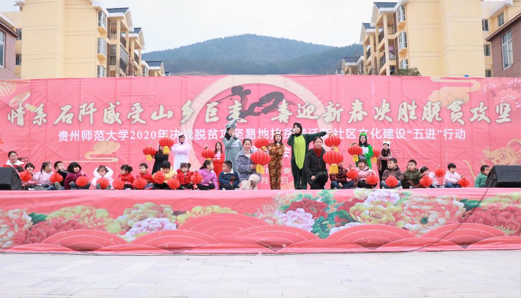 离开世代居住的故土,搬迁群众是否适应在城里过新年?临近春节,如何消除留守儿童心间的陌生与孤单?如何抚平新居民搬离故土的焦虑?针对这些现实问题,贵州师范大学利用寒假时间,组织以石阡籍学生为主的数百名志愿者团队,再次来到罗家寨安置点开展“五进”行动,用丰富多彩的文化活动,让搬迁群众的新年过得更加有滋有味。