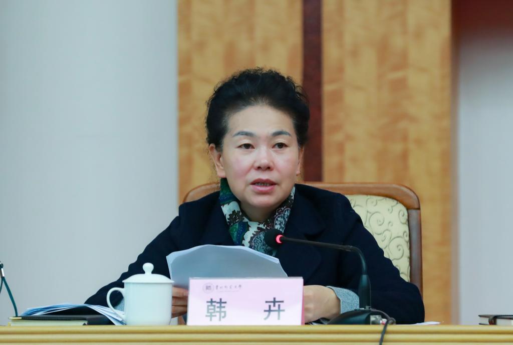 韩卉指出,自2019年9月12日贵州师范大学启动主题教育以来,学校党委认真贯彻落实习近平总书记在“不忘初心、牢记使命”主题教育工作会议上的重要讲话精神和中央、省委工作部署,聚焦主题主线,紧紧围绕“守初心、担使命,找差距、抓落实”的总要求,牢牢把握理论学习有收获、思想政治受洗礼、干事创业敢担当、为民服务解难题、清正廉洁作表率的目标,把学习教育、调查研究、检视问题、整改落实四项重点措施贯穿始终,推动主题教育取得了重要的阶段性成果。学校主题教育的主要做法和成效体现在:一是坚持把学习贯彻习近平新时代中国特色社会主义思想这一根本任务作为主线,进一步强化了党的创新理论武装,坚定了理想信念;二是坚持在推动学校改革发展和助力脱贫攻坚中守初心担使命,进一步强化了责任担当,提振了干事创业的精气神;三是坚持以刀刃向内的自我革命精神检视和解决问题,进一步深化了找差距抓落实的要求,提升了师生的获得感、幸福感;四是坚持发挥党员干部清正廉洁的表率作用,进一步巩固了良好的政治生态,持续推进了党风廉政建设;五是坚决扛起全面从严治党重大政治责任,进一步增强了政治意识,锤炼了政治品格。实践证明,主题教育为学校贯彻落实新时代全面从严治党要求积累了新经验、开创了新气象,让师生真切感受到了主题教育带来的新变化、新成效,对主题教育工作评价反映普遍向好。